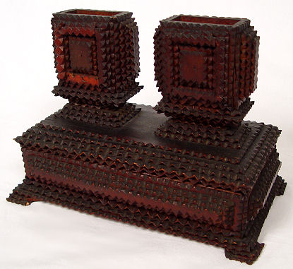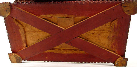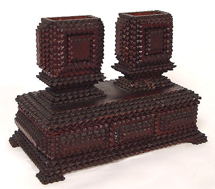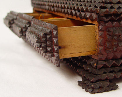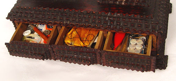 VINTAGE THREE DRAWER TRAMP ART SEWING BOX: Used as a sewing box with the contents still there. Two upper compartments perhaps held scissors or long needles. 8 1/2'' x 11 1/2'' x 6''.