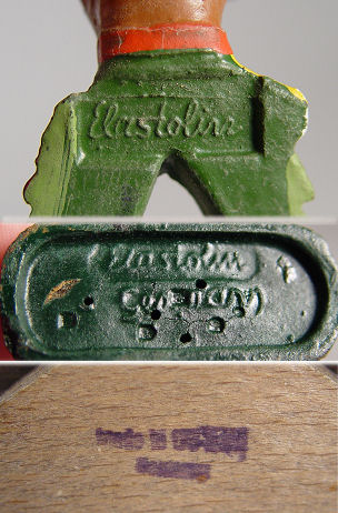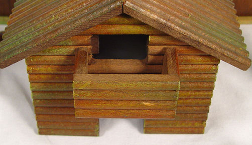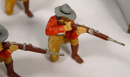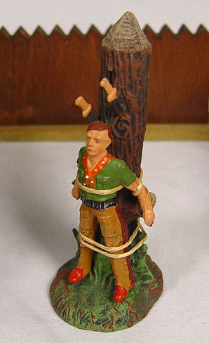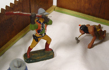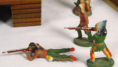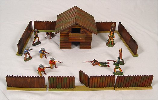 ELASTOLIN COWBOYS AND INDIANS WITH FORT AND FENCING: Six cowboys and 4 Indians, all in a battle position. Sold with the German made fort ( 6 1/2''h. x 7 1/2'') with removeable roof and 6 fence sections.