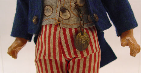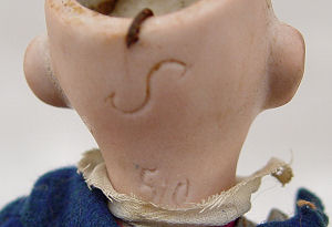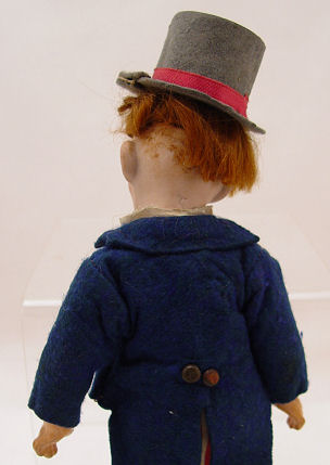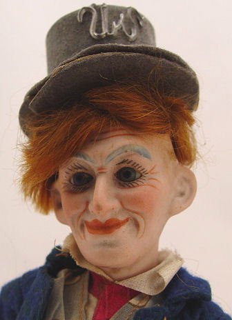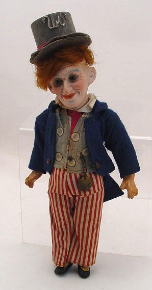 GERMAN BISQUE HEAD UNCLE SAM CHARACTER DOLL: Marked S/0, and a slightly horizontal S. Blue glass stationary eyes on a face full of character, original mohair wig, composition body, joint limbs, original clothing and hat. 9''l including hat.