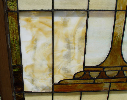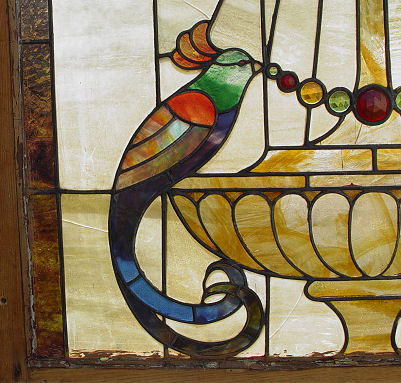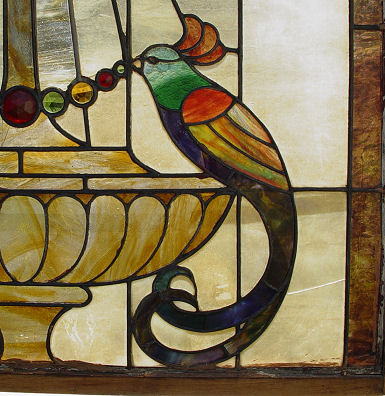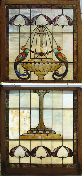 TWO PART STAINED GLASS WINDOW BIRD OF PARADISE WATER FOUNTAIN MOTIF: Each part is approximately 35''h x 34''w. Framed for hanging. Very colorful, upper section with bird, lower section with fountain. Some minor cracks in both pieces.