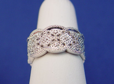 WIDE 18K FILIGREE BAND: Scalloped edging and faux beading scattered with tiny diamonds on a wide pierced band, size 6.75, solid place left at back of ring for ease of sizing, 7.2 grams.
