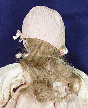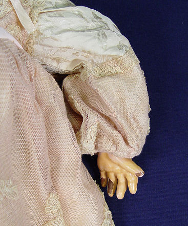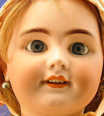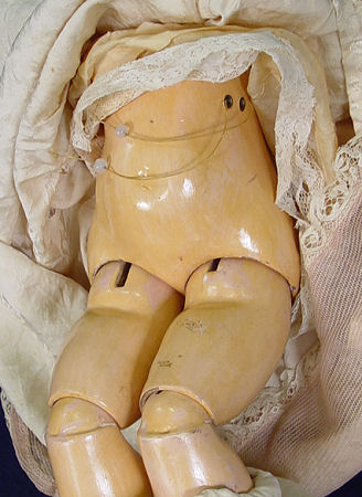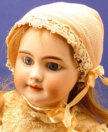 TETE JUMEAU FRENCH BISQUE HEAD DOLL: Back of the head is impressed ''Dep 10'' with TeTe Jumeau decal label. Back of the fully jointed composition body has the Bebe Jumeau Diplome d'Honneur oval paper label. Her face has blue glass open eyes, painted brows, open mouth with teeth, pierced ears. Non working string pull voice box. Dressed in French lace dress. 22'' h.