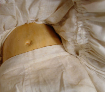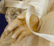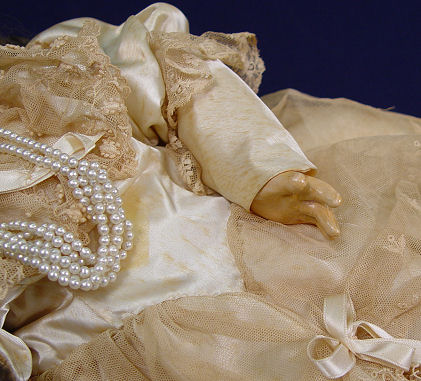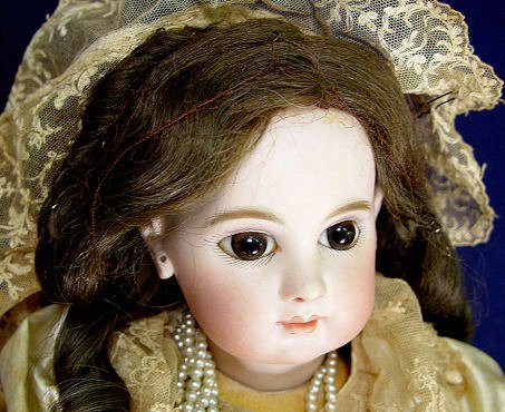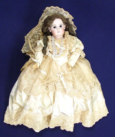 FRENCH JUMEAU TALKING FASHION DOLL: Bisque head with big brown glass eyes, closed mouth pierced ears, long brown finger curl wig. Composition body with jointed elbows and knees. Dressed in an elaborate satin and French lace gown with veil. Functioning pull string voice box. The back of her head in impressed Depose F8J, her body bears the Jumeau Paris label. 19'' h.