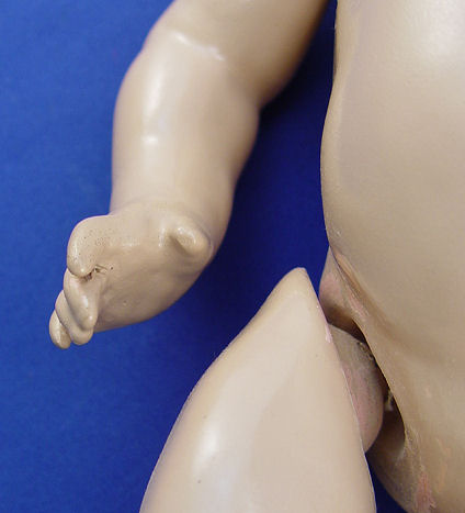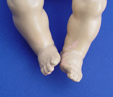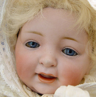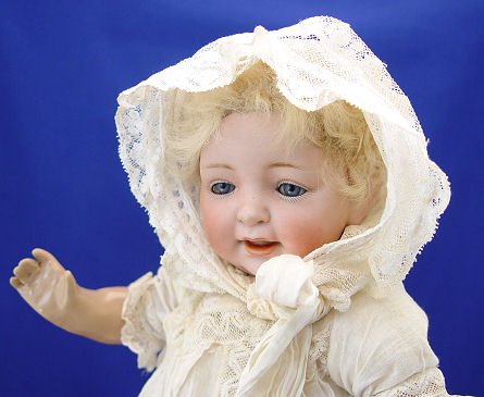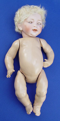 KESTNER GERMAN BISQUE HEAD BABY DOLL: With much character to the face, sleepy blue eyes, painted brows and lashes, open mouth and little double chin. Bent limb composition body, the wig is exceptionally soft and may have had her bangs trimmed. Back of head is marked 211 JDK, made in Germany may be under the wig. 13''l.