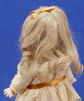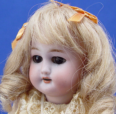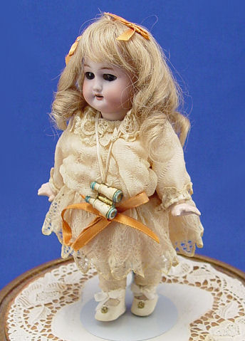 9'' SIMON & HALBIG GERMAN BISQUE HEAD DOLL: Marked S&H / Germany / 2. Appears to be all original in lace dress, undergarments, shoes, stockings and Stanhope binoculars. Bisque head with brown sleepy eyes, open mouth, 4 teeth showing and natural long blonde curly wig. 5 part composition body. 9''h.