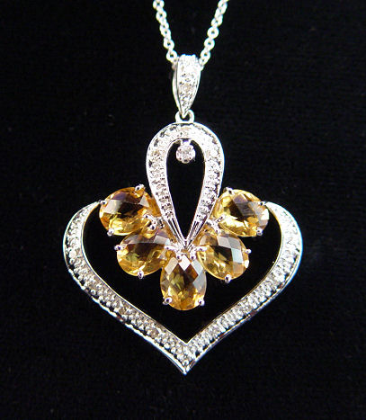CITRINE & DIAMOND NECKLACE: 2.78ct total of briolette cut citrines set in a diamond encrusted 14k white gold pendant, on a 16'' Italian 14k white gold chain. 5 grams.