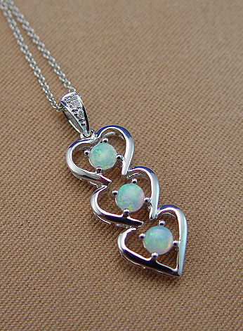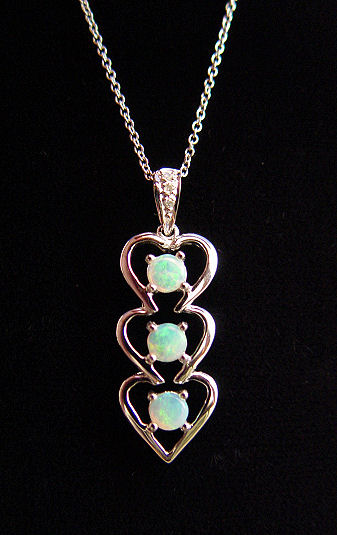 OPAL TRIPLE HEART PENDANT: Stacked heart pendant with each heart centered by a round cut opal, bail set with tiny diamonds, 14k white gold, 16'' chain, 3 grams.