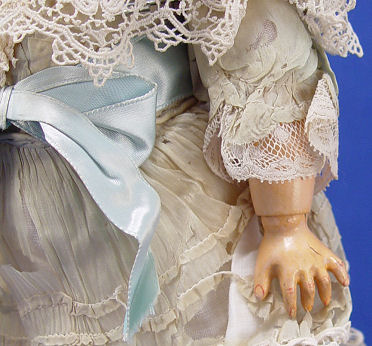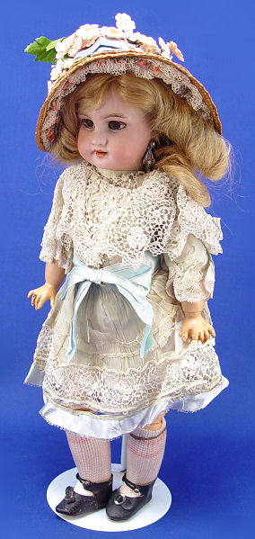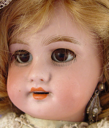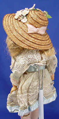 FRENCH BISQUE HEAD DOLL: Bisque head with brown sleepy eyes with lashes, open mouth, pierced ears long blonde curly wig. Back of head is marked DEP, we didn't unglue the wig for more info. Fully jointed wooden body and limbs. Au Nain Bleu label on the shoes. 15''h.