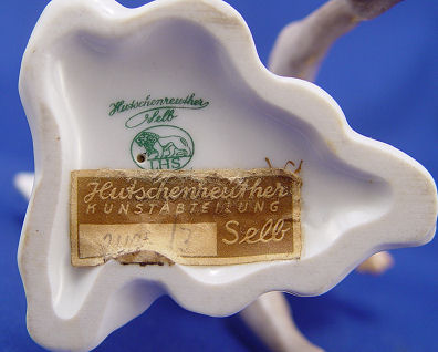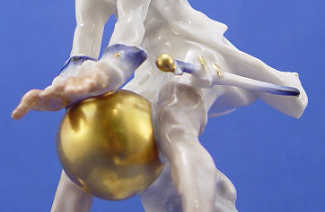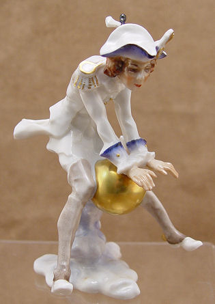 HUTSCHENREUTHER FIGURE PLAYING LEAP FROG: Young boy over the gold ball, Imprinted Hutschenreuther Selb'' as well as a paper label, 5 1/2'' h.