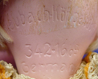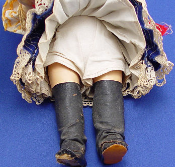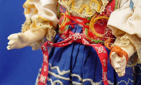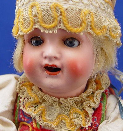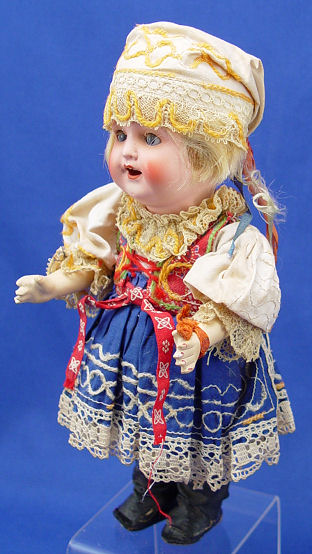 HEUBACH KOPPELSDORF GERMAN DOLL: Porcelain head doll in original ethnic costume including hat and boots. The back of her head is marked ''Heubach Koppelsdorf 342-166a Germany''. Sleepy brown eyes with lashes, open mouth showing 2 teeth, and the rosiest cheeks. Composition 5 part body. 9''h.