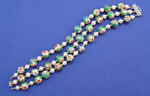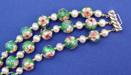TRIPLE STRAND CLOISONNE BEAD & PEARL BRACELET: 9.5mm cloisonne beads in a floral pattern on green ground strung with 5.5mm white pearls and tiny gold beads to create this lovely 7'' bracelet with 14k yellow gold pressure clasp.