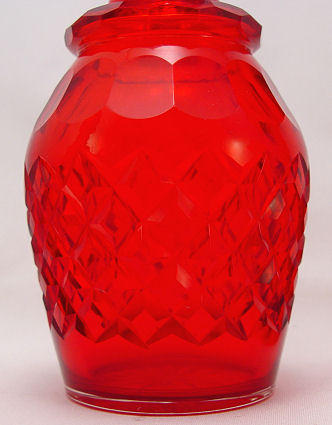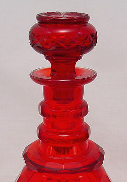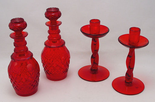 FINE RED GLASS DECANTERS AND CANDLE HOLDERS: A pair of each. 1) Spiral stem candles, 7 1/2''h. 2) Pair of decanters, 9''h. Unidentified makers.