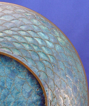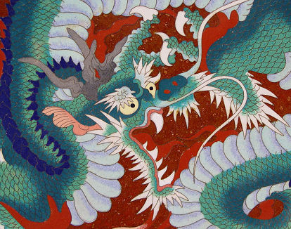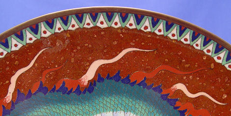 JAPANESE CLOISONNE CHARGER: Goldstone ground centering a vivid turquoise colored dragon, 14 1/4'' dia.