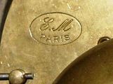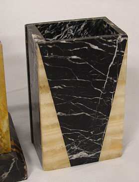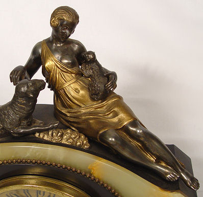 FRENCH DECO MARBLE FIGURAL CLOCK GARNITURE: Female shepherd with lamb and sheep perched on top, works marked EM Paris, with pendulum, 18''w., 15 1/2''h., 5''d., garniture 6 1/4''h. each.