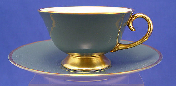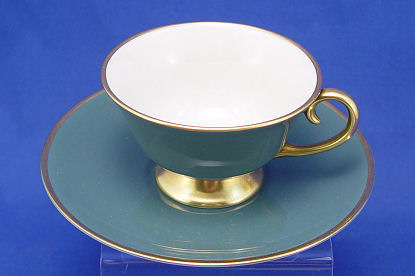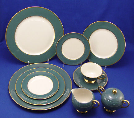 CALIFORNIA FLINTRIDGE FINE CHINA SERVICE: Lenox quality with teal border and gold rim. Includes 9 dinner plates, 6 salad plates, 10 bread plates, 15 cups and saucers, cream pitcher and sugar.