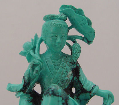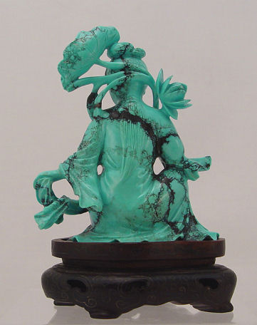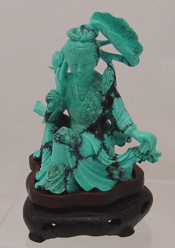CARVED TURQUOISE STONE QUAN YIN FIGURE: 2 3/4''h. Sold with custom fitted wood stand.
