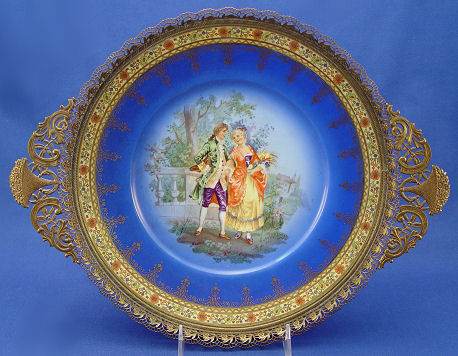 RETICULATED BRASS MOUNTED CZECH SERVING TRAY: Czechoslovakian service plated mounted into a scrolled foot frame with reticulated gallery type rim and flower basket motif handles. 11'' dia., 3 3/4''h.