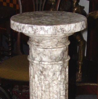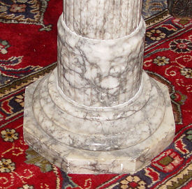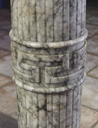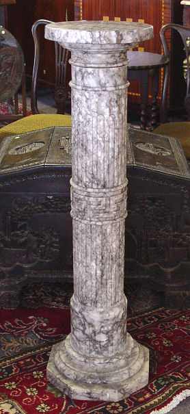 VARIEGATED GRAY MARBLE PEDESTAL: Lovely heavily veined fluted columnar pedestal with Greek key center banding, octagonal base stepped with round layers and round top, approx. 42''h., 11''dia.