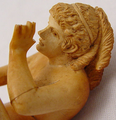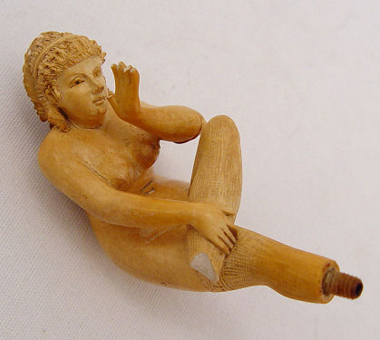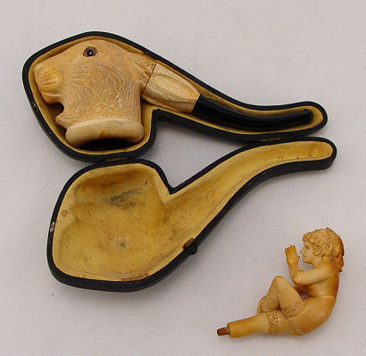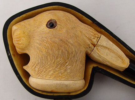 LOT OF TWO CARVED MEERSCHAUM PIPES: Rabbit head with glass eyes (1 cracked) in case from F Edwards & Co 14 Norris Street Haymarket London SWI, approx. 6''l overall, 2''h. And a miniature nude female figure in stockings, bowl opens in her back with right leg being the shank. With some damage, missing left foot and finger tips, approx. 2'' square. Sold as a lot.
