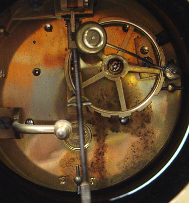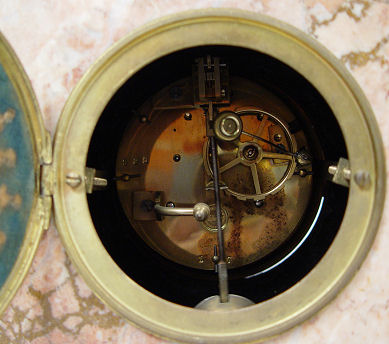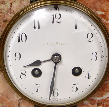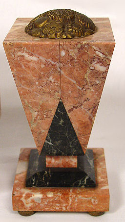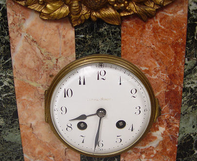 DECO MARBLE CLOCK GARNITURE: Works marked F Martin, pink and black marble with fruit ormolu decorations, clock 14''w. x 9 3/4''h, garniture 7 3/4''h., with key and pendulum.