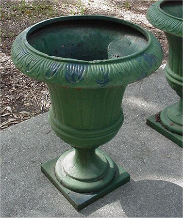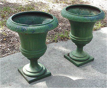 PAIR OF OLD CAST IRON GARDEN URNS: Green painted finish, 28''h., x 17'' dia. at the rim.