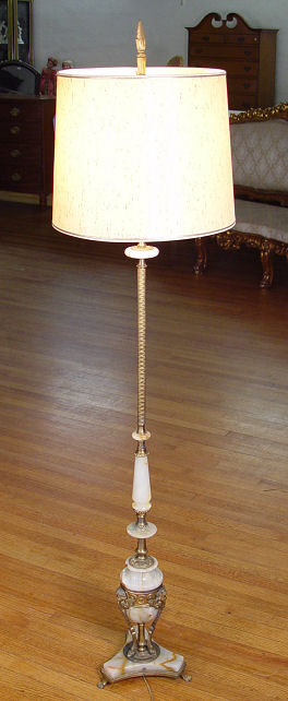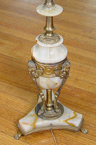 VINTAGE ONYX & BRASS FLOOR LAMP WITH ANGELS: Note the angle mounted urn shaped base and paw feet. 64''h. to the finial.