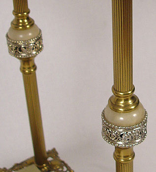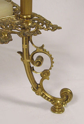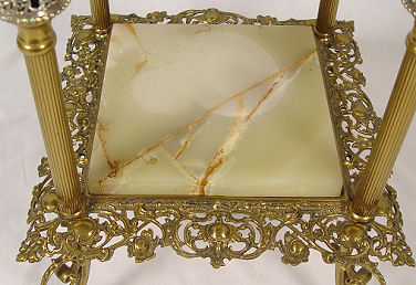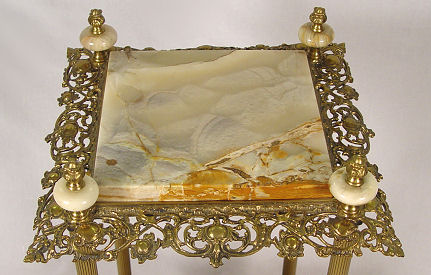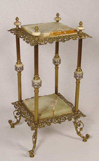 VICTORIAN MARBLE TOP FERN STAND: Ornate brass metal work stand with variegated marble set into both tiers, reeded supports with marble ball and silvered band decoration ending in scrolled feet, 32 1/2'' h. including finials, marble 10'' x 10'' with overall width of 15'' x 15''.