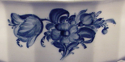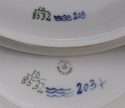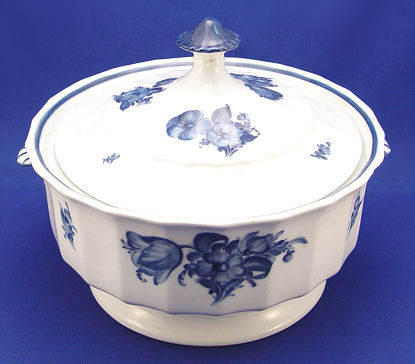 ROYAL COPENHAGEN COVERED SERVING BOWL: Ca. 1889-1922. Hand painted blue flowers, Green crown and Royal Copenhagen stamp in green with 3 wave mark, 8532 in green, 203 in blue.