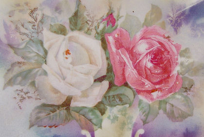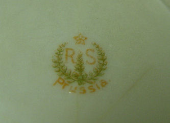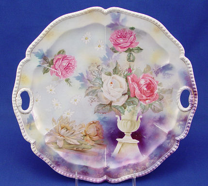 SIGNED RS PRUSSIA PLATE: Rose and water lily on pearlized ground, 11'' dia.