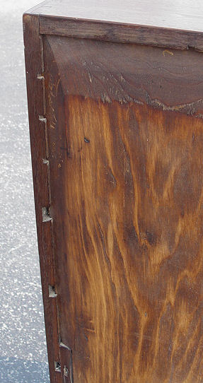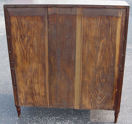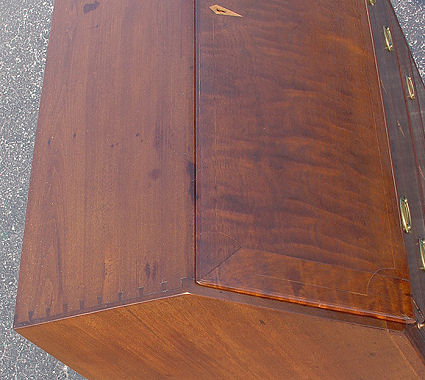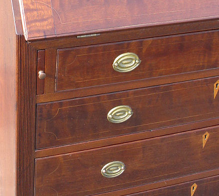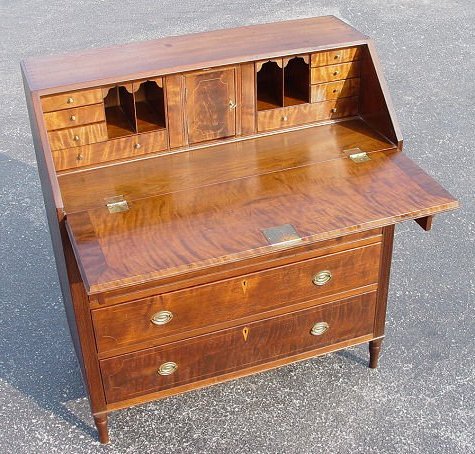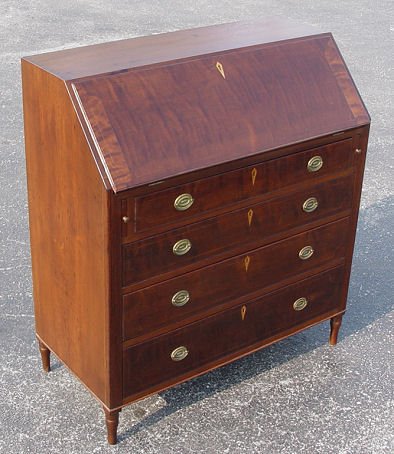A FINE EARLY 19TH CENTURY AMERICAN SHERATON DESK: Banded slant front top opening to a fitted interior of drawers and cubby holes, the case with four full length drawers, brass pulls, reeded stiles, dovetailed and mortise and tendon construction. 44 1/2'' h x 39 7/8'' x 19 1/8''. Writing surface is 34 1/2''h. Est. $3500/5000**