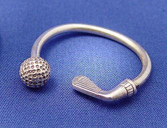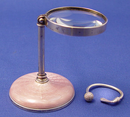 TIFFANY & CO GUILLOCHE ENAMEL TABLE TOP MAGNIFIER: Miniature sterling and white banded lavender guilloche enameled stand support a 2'' magnifying glass, marked on base Tiffany & Co Sterling D3189-46 15, approx. 3''h. Sold with a Tiffany & Co sterling bent golf club key ring.