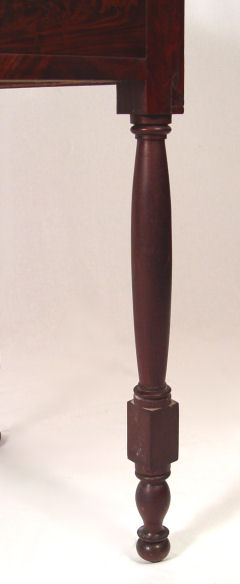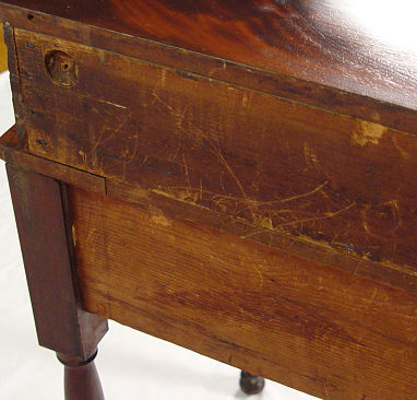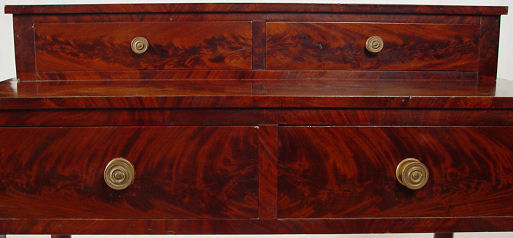 19th C EMPIRE STEP BACK FOYER DESK: Lovely crotch grain mahogany veneer, 2 drawer over two drawer, round brass pulls. 34 7/8''w. x 19 1/8''d. x 36''h.