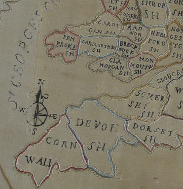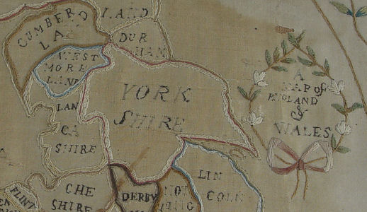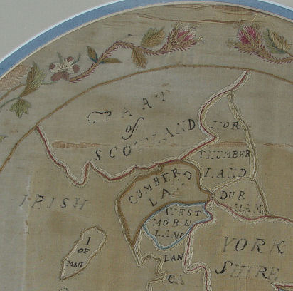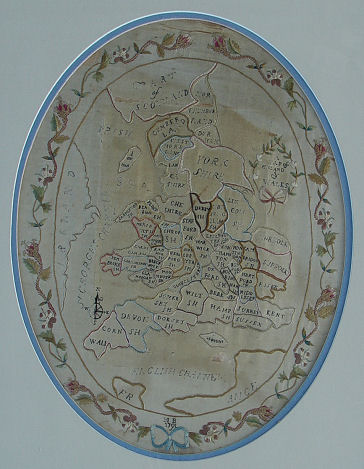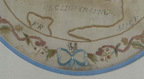 SILK NEEDLEWORK MAP OF ENGLAND DATED 1791: Silk on silk embroidered map of England and surrounding areas worked by MP. Framed in border of flowers. The floral stitching is intact thou there is loss of black thread on the titles. Age related discoloration, loss of silk ground. 14'' x 10 3/4''. Framed and matted under glass 18 1/2'' x 15 1/2'' overall.