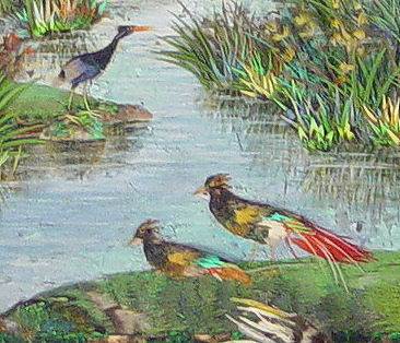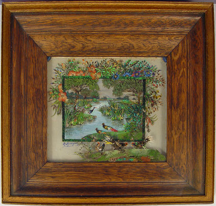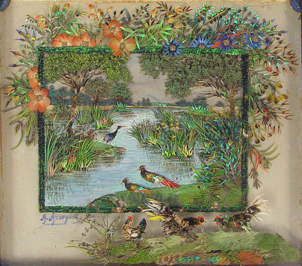 DIMENSIONAL SCENIC LANDSCAPE MADE ENTIRELY OF FEATHERS: Signed A. Arroyo R. Painted background with the most vibrant feather birds and vegetation. Tiered for a dimensional effect. Framed under two layers of glass in a double oak frame. 13 1/4'' x 12'' overall.