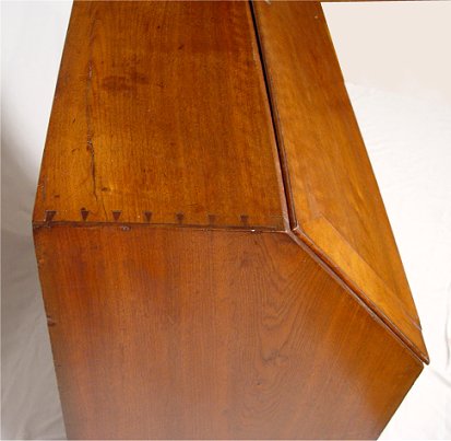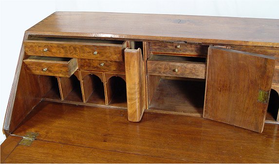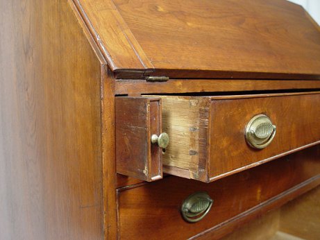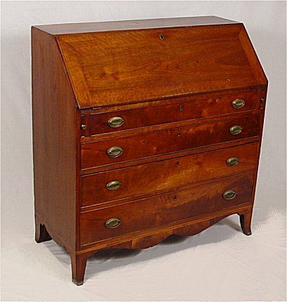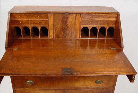 PERIOD WALNUT HEPPLEWHITE SLANT-FRONT DESK WITH CRADLE DRAWER: Slant front bureau desk with interior drawers, pull out letter slots, and pigeon holes. String inlay on the interior and the bottom. Full length drawers with the bottom two drawers are actually one deep drawer, said to be a cradle. Dovetail and square head nail construction. 44 1/4''h. x 42'' x 19''. Est. $3000/4000**