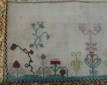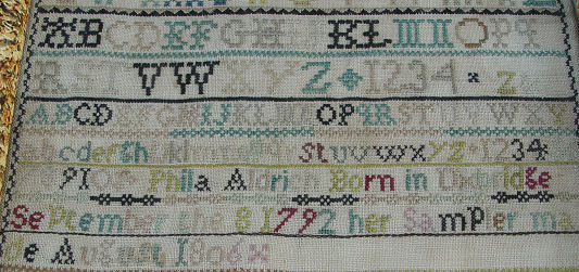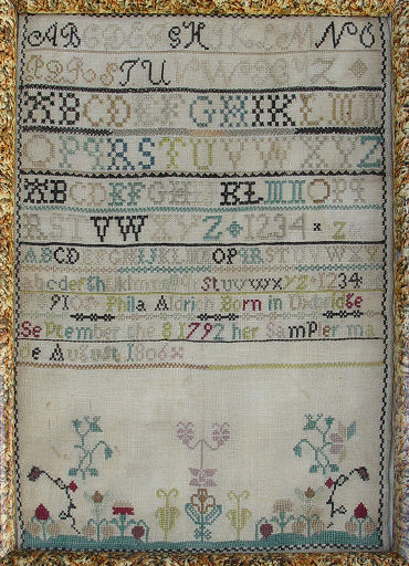 MASSACHUSETTS SAMPLER DATED 1806: Worked by ''Phila Aldrich born in Umbridge September the 8 1792 her sampler made August 1806. Silk petit point on fine gauze, sometimes referred to as tiffany cloth, using both cross and tent stitch. Dividing bands using a variety of stitches. Vivid shades of green, red, yellow, brown, black, teal and tan. Alphabet in upper case script and arabic. One row of lower case alphabet and numbers 1 to 4. Lower portion with a green knoll and a variety of flowering plants and strawberries. The whole being in excellent condition. Sight size 9'' x 12 1/2'', framed under glass, 14 1/2'' x 11'' overall.