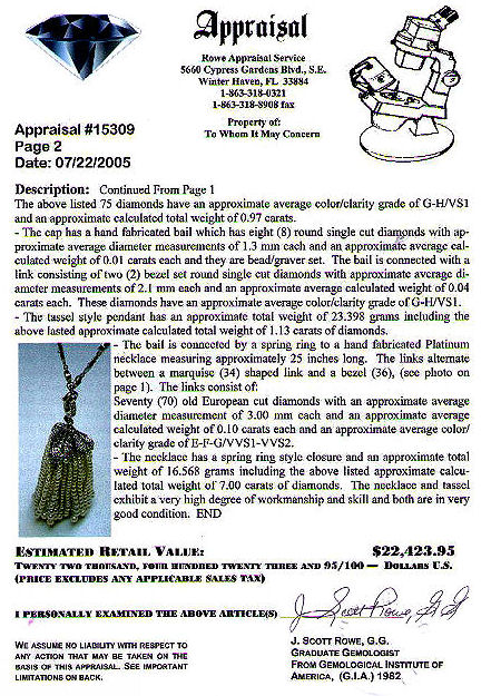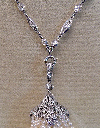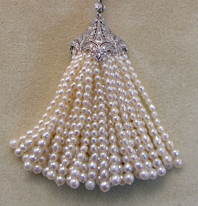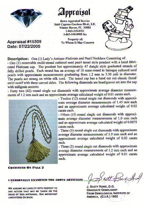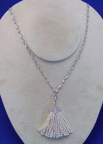 ANTIQUE PLATINUM, DIAMOND & PEARL SAUTOIR: Wonderful quality necklace with millgraining to both sides of the platinum chain, set with approx. 70 old Euro cut diamonds, approx. 7ctw, in marquise shaped and bezel set links. The tassel consists of a diamond encrusted cap, hand cut floral swirl motif with three sides set with approx. 1ctw average GH color and VS1 clarity, supporting 47 strands of graduated pearls, pendant approx. 2 5/8''l., necklace approx. 25''l., overall 40 grams. Sold with current GIA appraisal, estimated retail value $22,423.95. Est. $10000/14000**