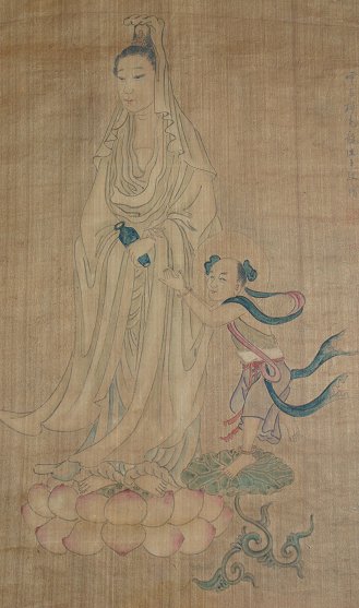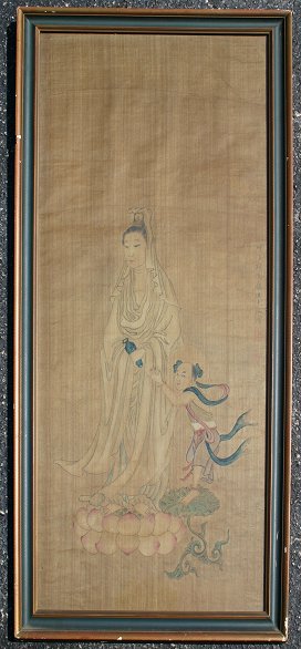 ORIENTAL PAINTING/SILK OF MAIDEN WITH CHILD: Signed, with frame 39'' x 18''.