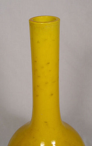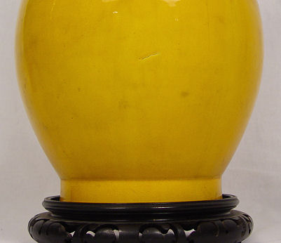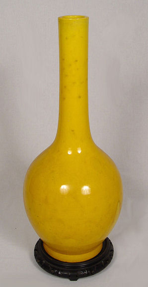 ANTIQUE CHINESE PEKING PORCELAIN VASE: Stunning saffron yellow glaze on tall bottle neck vase, 24''h. excluding the wooden stand.