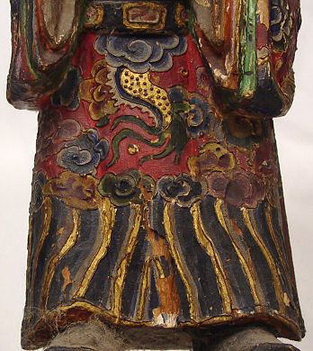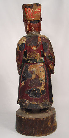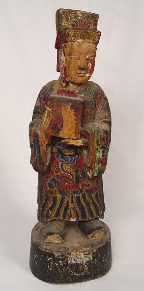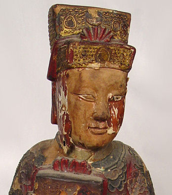 ANTIQUE CHINESE CARVED WOOD FIGURE: Polychrome finish in worn condition, 28'' h.