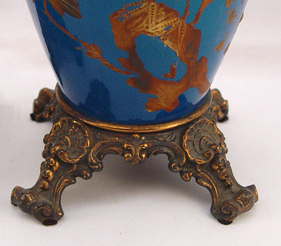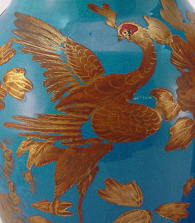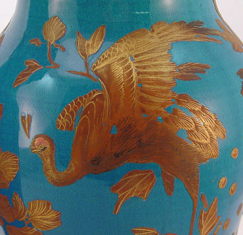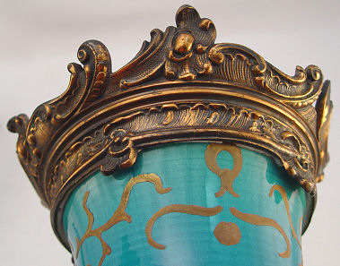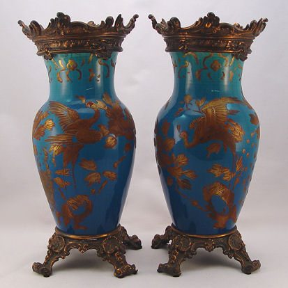 PAIR TURQUOISE GLAZE ORIENTAL VASES: Puffed gilt decor, bored for later additions of metal mounts. 15 3/4''h.