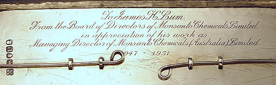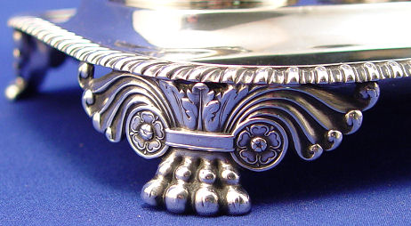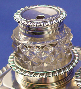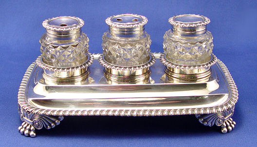 GEORGIAN STERLING TRIPLE JAR INK STAND: London, date mark 1795, makers Rebecca Emes and Edward Barnard. Raised paw feet, gadroon edging along rim of stand and bottles. All original having every silver part hallmarked. Three glass bottles, double pen tray. 9'' x 6 1/2''. As an historical note, the underside was much later inscribed to James Lum, project director for development of the atomic bomb.