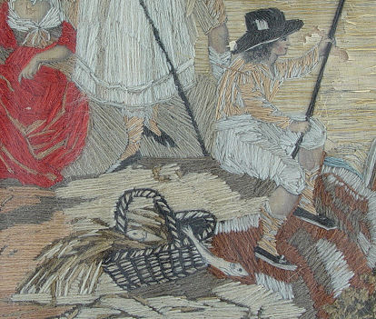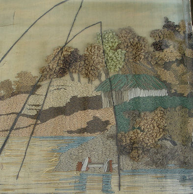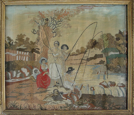 THE BOSTON FISHING LADY NEEDLEWORK ON SILK: Ca. late 1700's. Embroidery needlework and water color on silk ground using both silk and wool thread in a variety of needlework stitches including stump work, short and long stitch, and seed stitch. Depicting the Boston fishing lady and three companions, the seated lady in red holds a small baby. Facial features and fish in the basket are painted in water color, as is the sky. Finely executed with all colors vivid and no loss of color and stitches. The silk is fragile and there is some loss of the silk background fabric in the upper section of the sky. Sight size 14 1/2'' x 17 1/2'' framed under glass 22'' x 18 1/4'' overall.