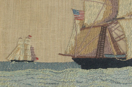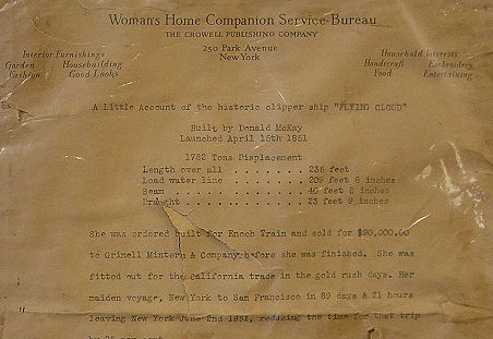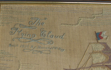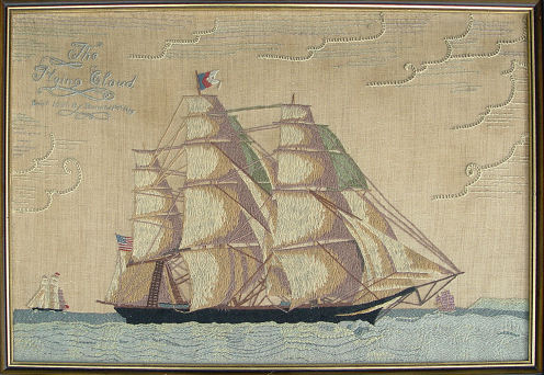 SAILOR'S WOOLWORK ''WOOLIE'' of THE FLYING CLOUD: Depicting the clipper ship, ''The Flying Cloud'' launched in 1851. The history of the flying cloud accompanies this piece, published in the Woman's Home Companion Service Bureau, the Crowell Publishing Company, 250 Park Avenue, New York. Worked in wool on a fine linen ground, using a variety of stitches including button hole, padded and long and short stitches. ''Woolies'' are embroidered ship portraits sewn while at sea and more often made by a sailor who was accomplished in sewing and other textile skills needed to repair sails and mend clothing. A large example in excellent condition, measuring 32'' x 20'', framed under glass, 23 3/4'' x 35'' overall.