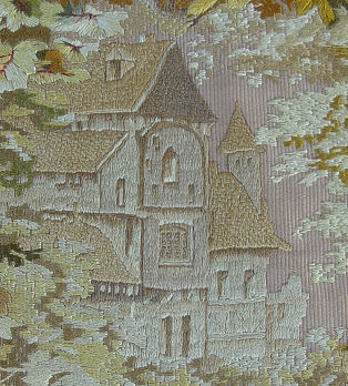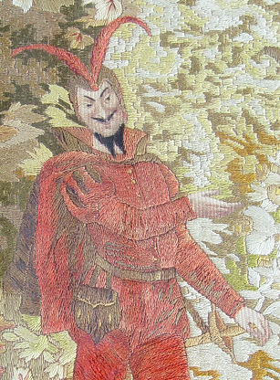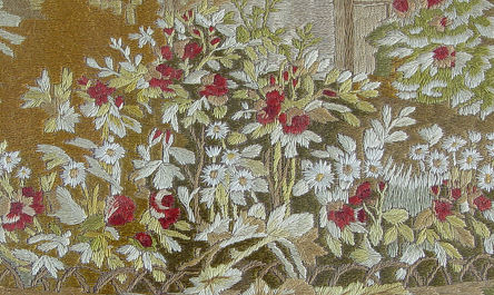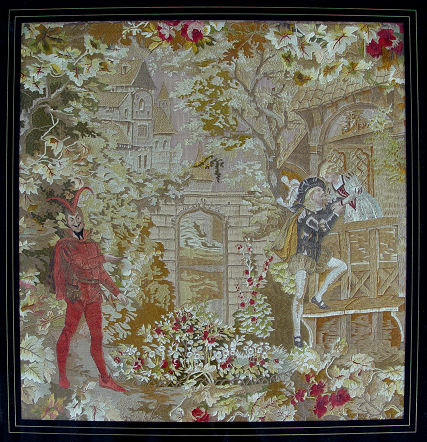MAGNIFICENT SILK NEEDLEWORK DEPICTING A SCENE FROM FAUST: Ca late 1700's or early 1800's. An extremely rare and important silk needlework. The entire canvas is worked in silk thread with the exception of the skin tones which are in water color. First time offered on the open market. The setting is of a garden scene with Marguerite leaning from a balcony in conversation with Faust. Mephistopheles in his usual red suit is as an onlooker. There is an open doorway surrounded with colorful flowers. Through the arched gate is a path leading to a castle. A wide variety of colors are used and still very vivid. The entire needlework is in excellent condition and retains the sheen of the silk thread. Embroidery itself is 17 1/2'' x 17 3/4'', Framed under glass, overall dimensions 24.50'' x 24.50''.