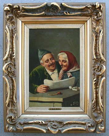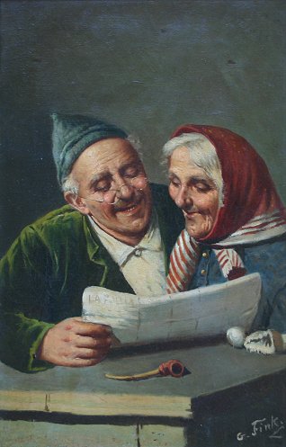 19TH C GENRE SCENE OF AN ELDERLY COUPLE: ''A Good Story'', O/C, 15 1/4'' x 9 3/4'', period gilt frame with minor damage, 24 1/2'' x 19 3/4'', SLR G. Fink.