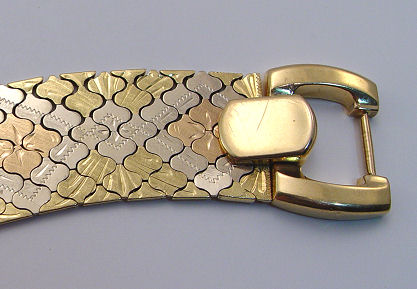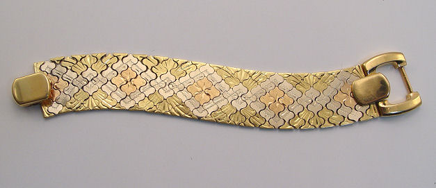 ITALIAN 18K TRI COLOR GOLD BRACELET: Lovely shaped links, etched and arranged to form flowers of rose gold in white gold rhombus on a yellow gold ground, open buckle motif clasp, marked 750 159VI and tiny touch mark to bar, approx. 8'', 71 grams.