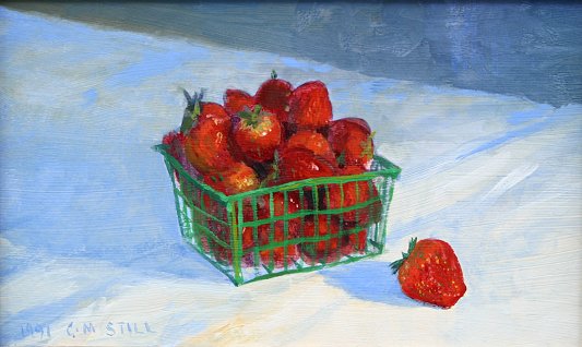 STILL, Christopher M., (American, 20th C): ''Basket of Strawberries'', O/B, 6 1/2'' x 10'', signed lower left and dated 1991, encased in contemporary frame, 12 1/2'' x 16 3/8''. From the Beatrice Altman collection. Est. $600/800**