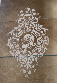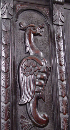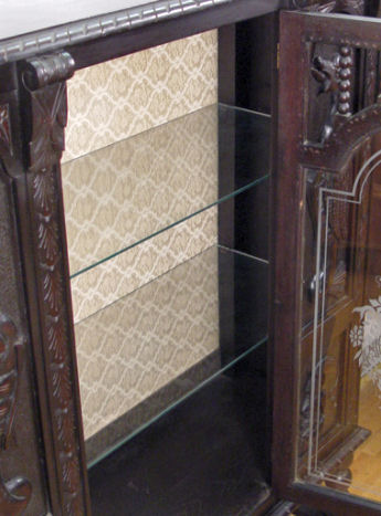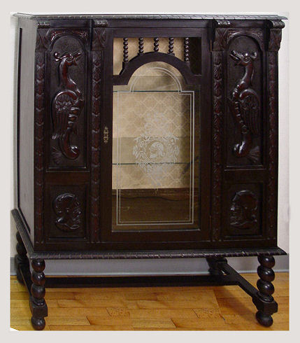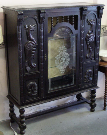 BLACK WALNUT MEDIEVAL REVIVAL CARVED CHINA CABINET: CA. 1890's. Etched glass door centered between carved panels of mythical beasts. Glass shelf interior. 60 3/4'' x 50'' x 17''.