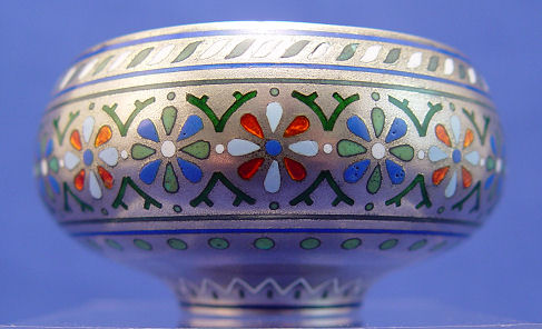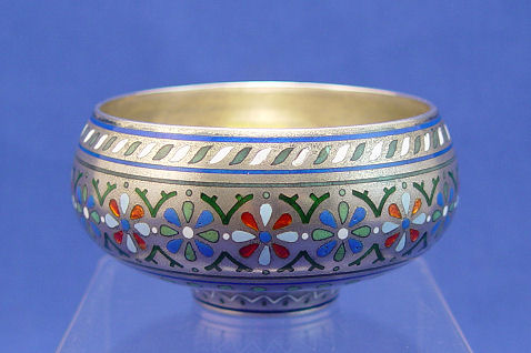 RUSSIAN CHAMPLEVE ENAMEL BOWL, CA 1881: Delicate floral pattern on silver ground, 3 1/8''dia., 1 5/8''h. Marked to bottom with Imperial mark, Moscow 88, maker Pavel Akimov Ovchinnikov, dated 1881 under mark for unidentified assayer.